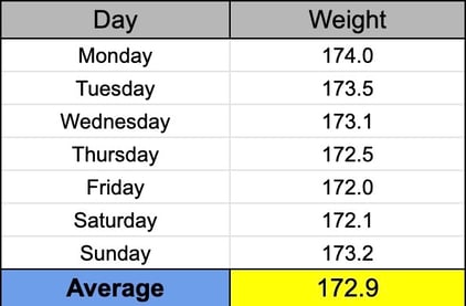 It's also beneficial to have a daily bodyweight number so you can take a weekly average of those 7 days. For example:
